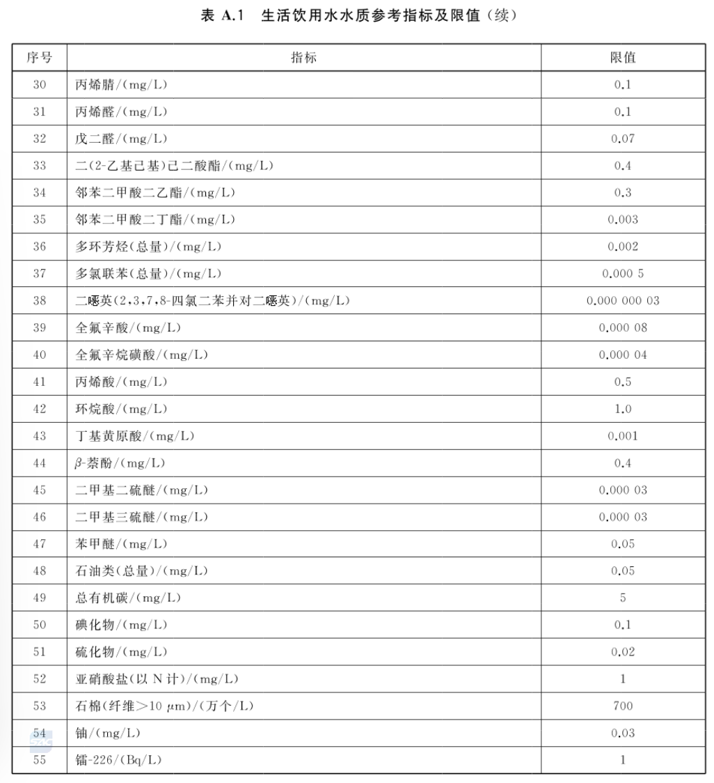 注:当生活饮用水中含有附录A所列指标时,可参考表A.1中该指标的限值评价。