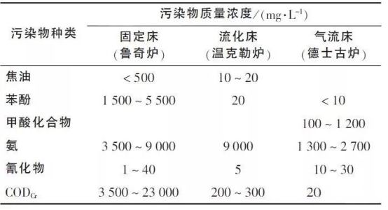 三种气化工艺产生的废水,氨含量均很高;固定床工艺产生的酚含量高,其它两种较低;固定床工艺焦油含量高,其它两种较低;气流炉工艺中产生的甲酸化合物较高,其它两种工艺基本不产生;氰化物在三种工艺中均产生;有机污染物COD,固定床工艺产生较多,污染较严重,其它两种工艺污染较轻。